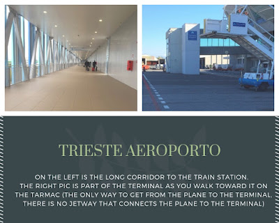 I arrived, headed downstairs, bought my ticket for the train into Trieste at a machine (4,05 euro) and headed to the train station. This was the only trek to be made. Once you exit the the terminal following the signs to the train station, you’ll have about a 10-15 minute walk, complete with people movers.